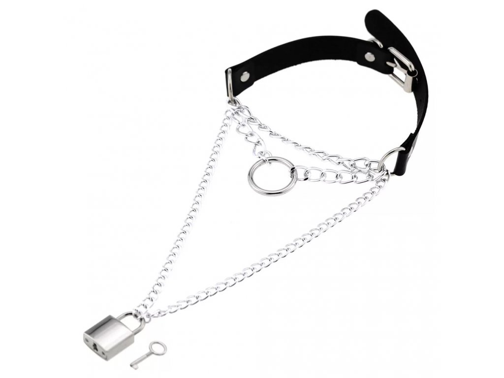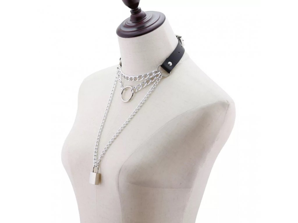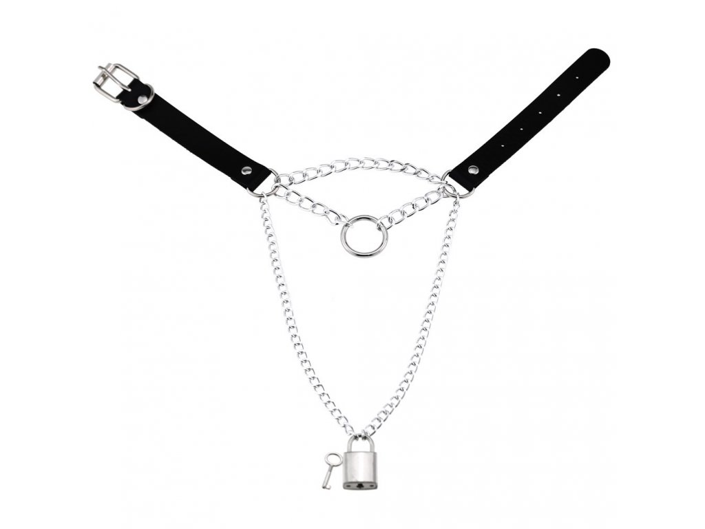popruh - CHOKER / bodypiece harness černý s třemi stříbrnými řetízky