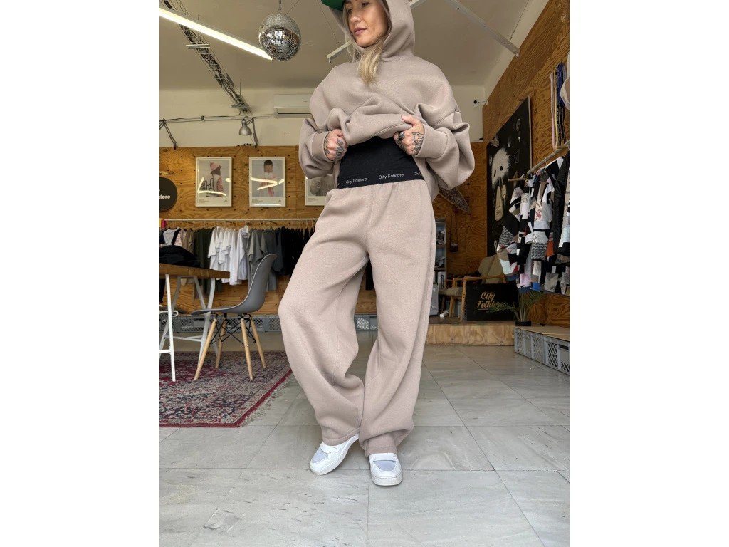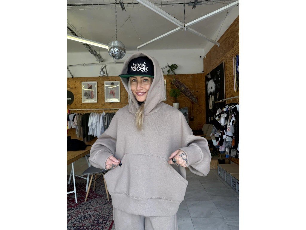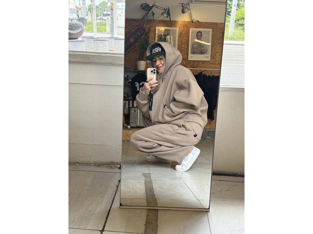 Nejstylovější, nejměkčí, nejpohodlnější. Taková prostě je. Prostě je. Prostě je! Souprava skip s vysokogramážního výplňku v přitozené barevné zemité škále. Široké, dole mírně zůžené kalhoty, aby nepadaly přes boty,se dvěma kapsami na bocích ve švu a jednou hlubokou na zadku. V pase pruženka s nápisem labelu. Ovesized crop mikča s prostornou kapsou na předním díle a a hlubokou skvěle tvarovanou kapucí. Dostupno v několika barevných provedeních a dvou velikostech, které pokryjí většinu konfekčních velikostí.