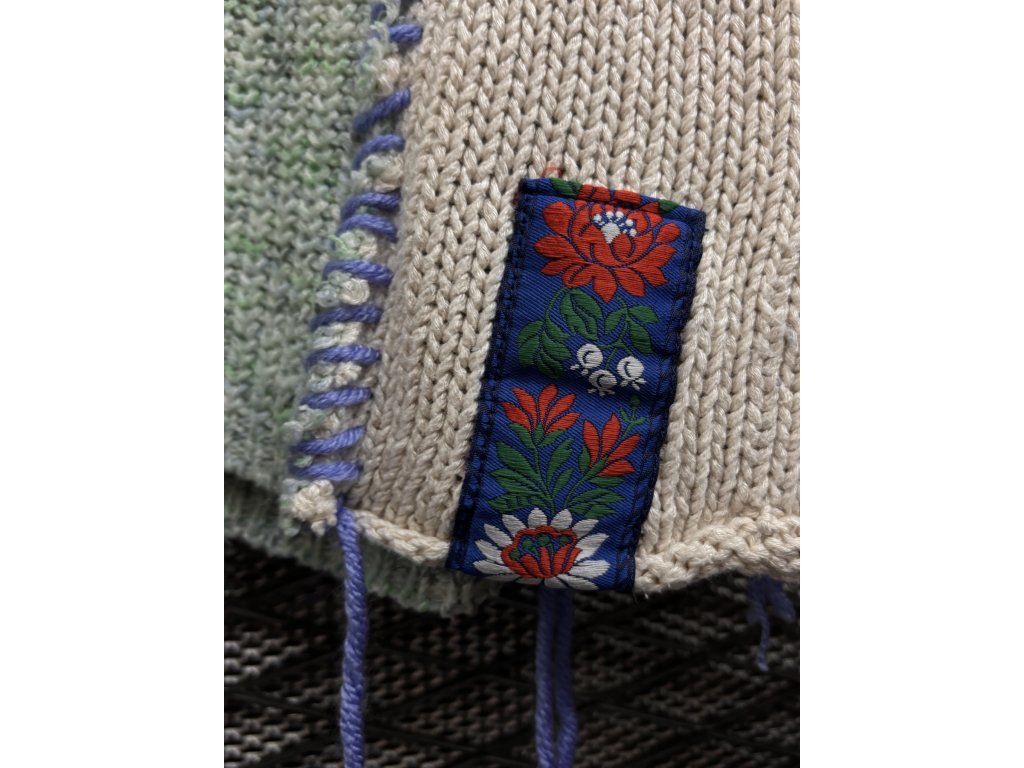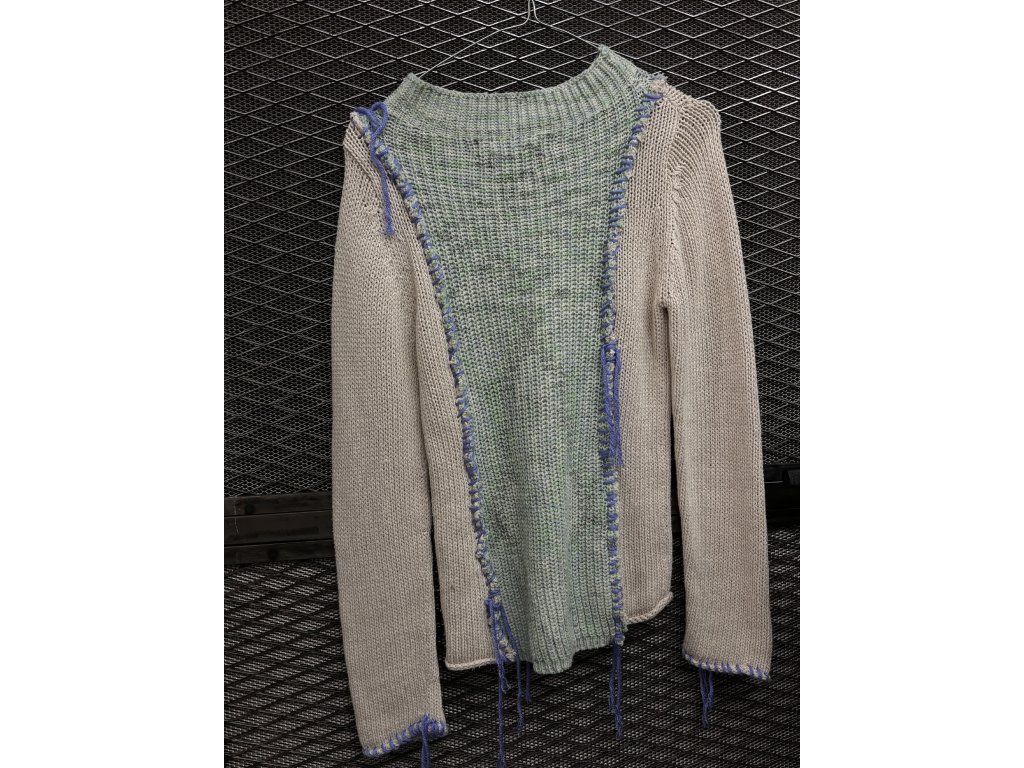 Nevšední upcyklovaný svetr je sešitý z několika kusů.