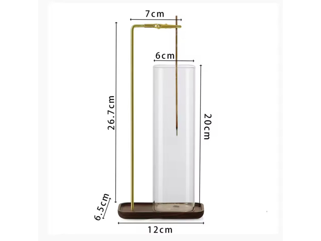 Minimalistické provedení v kombinaci dřeva, kovu a skla působí stylově a zároveň prakticky. Skleněná trubice bezpečně zachytává popel, takže okolí zůstává čisté a bez nepořádku. Díky chytrému uchycení lze snadno použít jak klasické tyčinky, tak i jemné vonné provázky.