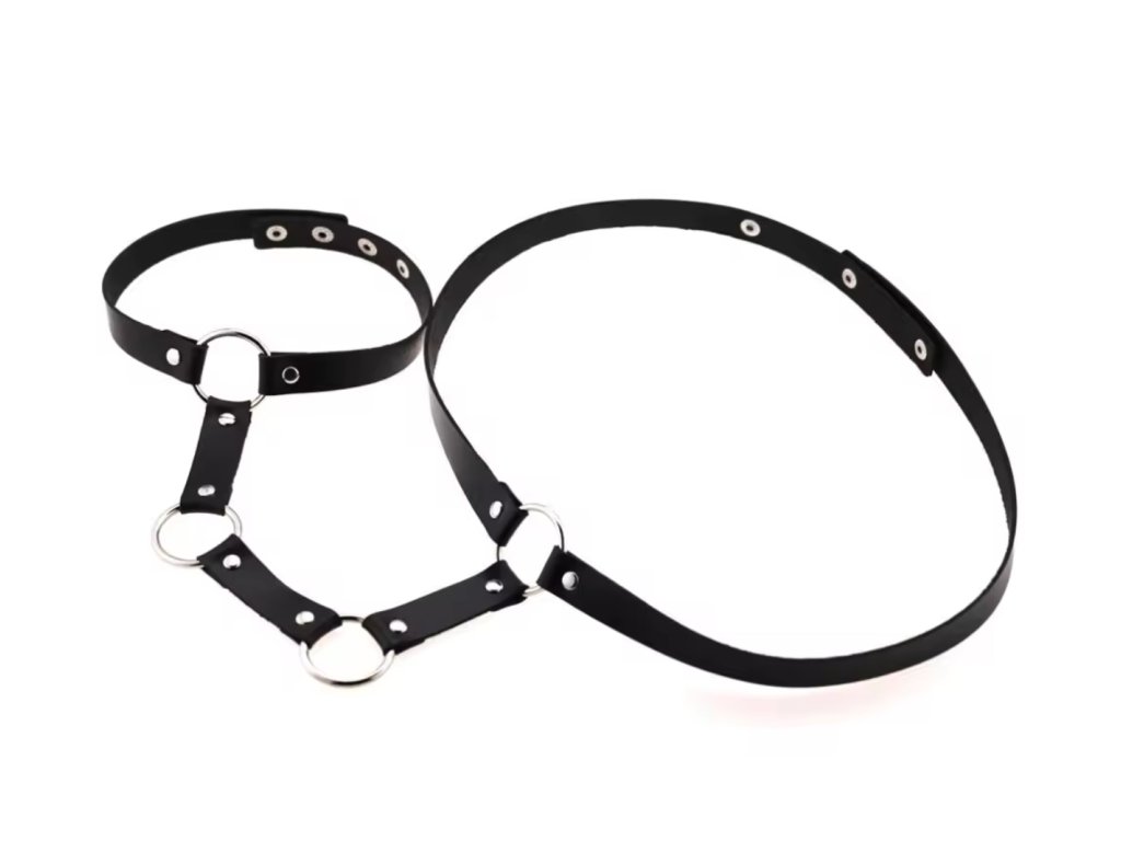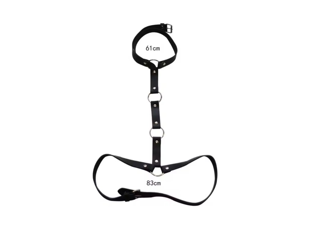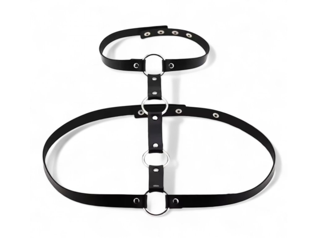 Tento výrazný postroj aka harness kombinuje elegantní koženkový design s odvážnými kruhovými detaily, které přitahují pozornost. Postroj je vybaven integrovaným chokerem, který dodává celkovému vzhledu další vrstvu sofistikovanosti. Tři kovové kruhy umístěné ve středu těla zvýrazňují moderní a alternativní styl.