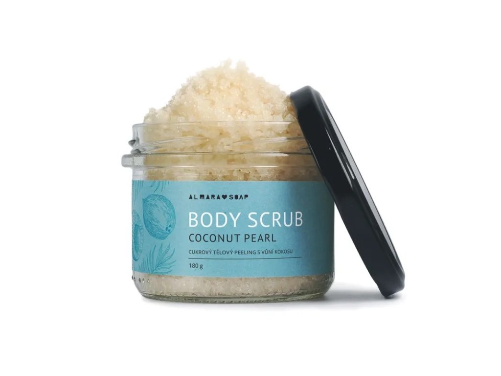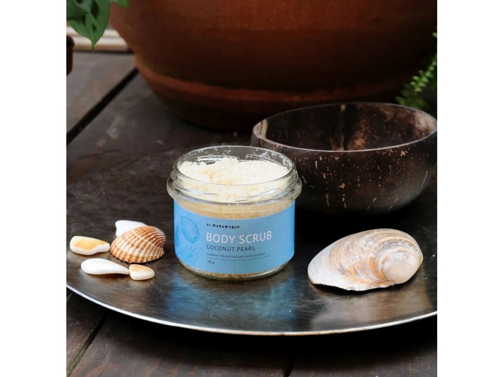 Scrub Coconut Pearl má základ z bio třtinového cukru. Dále je obohacený o rostlinné oleje – mandlový a BIO kokosový olej, díky kterým krásně klouže po pokožce a zároveň ji vyživí. Po opláchnutí zůstane pokožka promaštěná a není třeba používat tělové mléko či olej. Složení doplňuje strouhaný kokos a přírodní vůně kokosu. Ta je jemná, krémová, sladká a voní jako čerstvě utržený kokos.