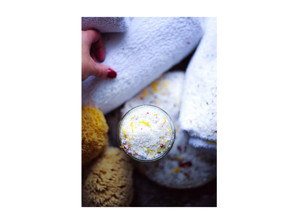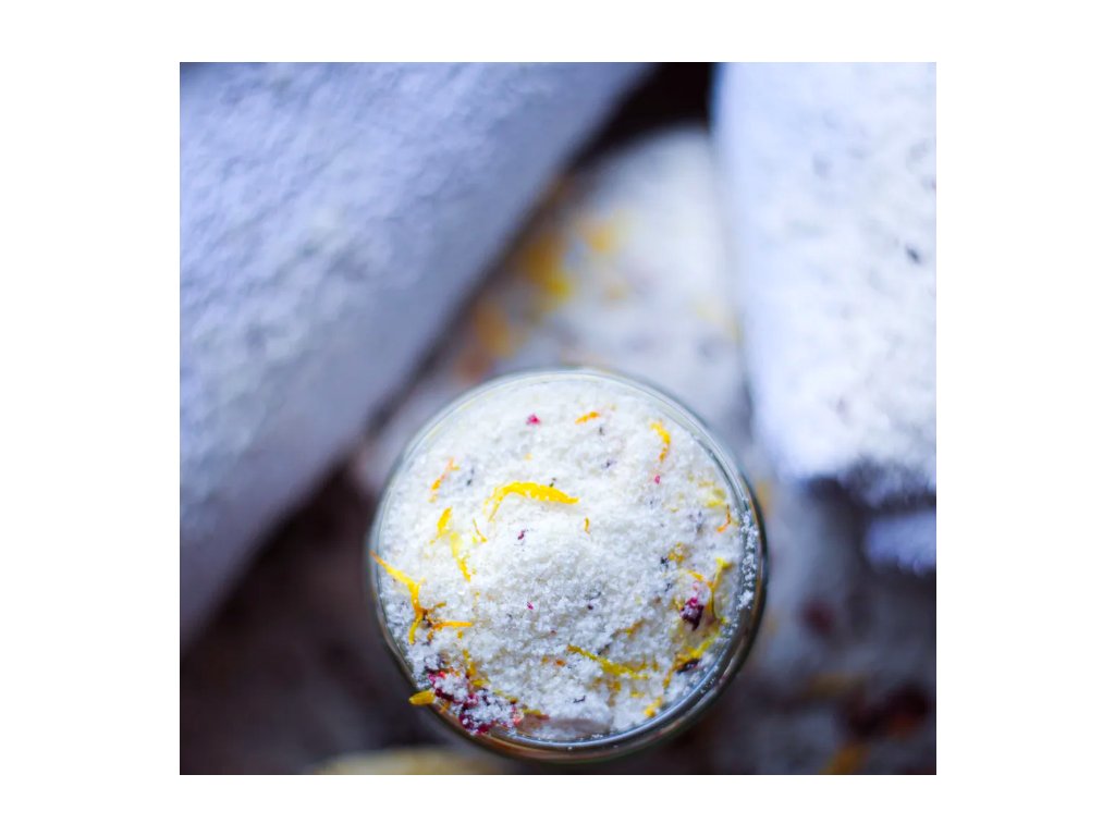 jemně mletá mořská sůl, epsomská sůl, bio himálajská růžová sůl, parfém, slunečnicový olej, květy měsíčku, květy růže, mandlový olej