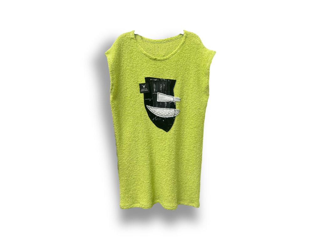 Výrazné pletené šaty, které spojují originální design s uměleckým výrazem. Tento kousek vzniká s důrazem na kreativitu a jedinečnost – každé šaty jsou díky ruční malbě a pletenému materiálu trochu jiné, takže váš outfit bude vždy unikátní.